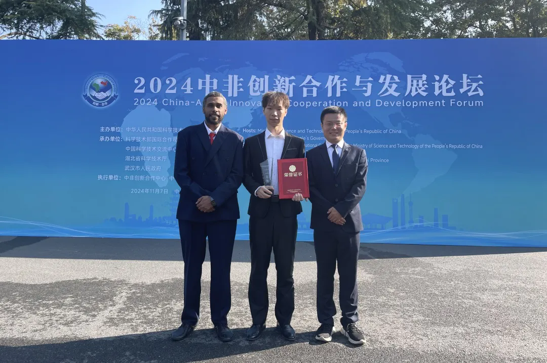 論壇面向全國共征集到中非科技創(chuàng)新合作成果321項,并現(xiàn)場舉行了第三屆中非青年創(chuàng)新創(chuàng)業(yè)大賽決賽頒獎儀式。我院孵化團隊中英納米能源材料研究中心的“水從陽取——太陽能水蒸發(fā)材料及其應(yīng)用”項目獲得一等獎,團隊成員YAHYA ALEMIN SALIH ALEMIN(中文名為嚴亞明)來自蘇丹。