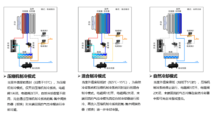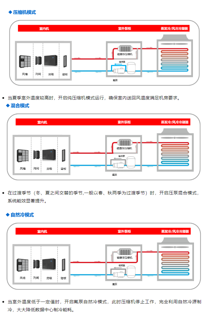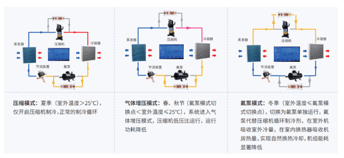 目前氟泵技術(shù)最成熟的產(chǎn)品要屬氣體增壓氟泵機組,該方案為室內(nèi)機和室外機分體設(shè)計,配置靈活,適用于各種規(guī)模的數(shù)據(jù)中心場景。氟泵機組系統(tǒng)具有三種運行模式,并最大限度的充分利用室外自然冷源,例如海悟的氟泵機組其運行原理如下: