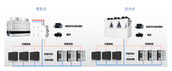 除了分體氟泵和整體式氟泵PHU以外,針對大型數(shù)據(jù)中心場景,并對PUE有著極高要求的場景(例如:PUE≤1.2),可以采用磁懸浮相變多聯(lián)系統(tǒng),該系統(tǒng)主要應(yīng)用了磁懸浮變頻技術(shù)、蒸發(fā)冷凝器技術(shù)、變頻氟泵技術(shù)、末端多聯(lián)技術(shù)等。目前主要的冷卻形式有磁懸浮蒸發(fā)多聯(lián)系統(tǒng)和磁懸浮風(fēng)冷多聯(lián)系統(tǒng)。