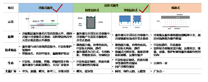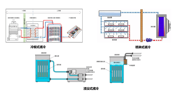 目前液冷技術(shù)主要有三大類,分別是噴淋式液冷、浸沒式液冷、冷板式液冷,其示意原理圖如下: