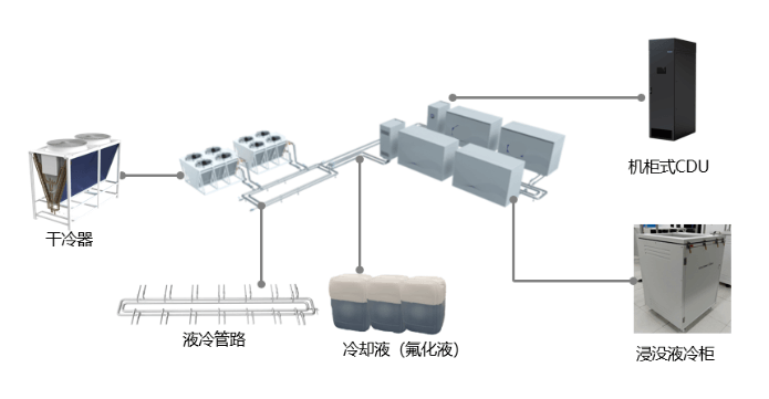 場景三:此方案采用單相浸沒式液冷,室外采用干冷器,配合雙機柜式CDU,最大支持功率密度為30~100KW,整體液冷方案年平均PUE可以做到1.1及以下。