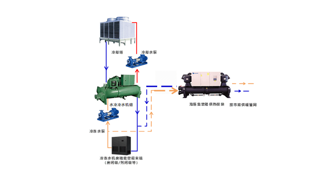 將數(shù)據(jù)中心制冷與辦公區(qū)域采暖集成于一體,最大限度的實現(xiàn)能源的綜合利用。其熱回收原理如下: