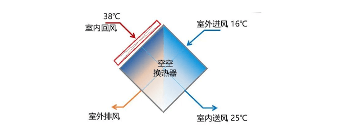 此處(AHU機組換熱芯體室內(nèi)回風(fēng)側(cè))熱量品位較高,回收效果最佳。然后,再過AHU機組中的空-空換熱器與室外空氣換熱,此時AHU可根據(jù)室內(nèi)回風(fēng)溫度自動調(diào)節(jié)進入空空換熱器的室外冷風(fēng)。