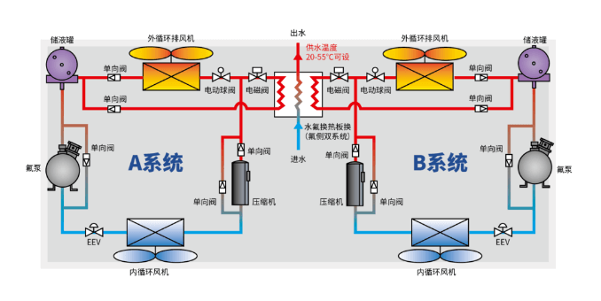 在壓縮機排氣管路上并聯(lián)一個熱回收模塊(水氟換熱板換),通過電磁閥來控制熱量的流向控制,回收排氣熱量,提供采暖熱水。通過電磁閥與電動球閥調(diào)節(jié)整機供熱量。A/B系統(tǒng)分級切入/切出熱回收工況,避免水溫劇烈波動。