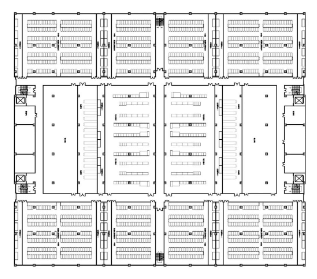 數(shù)據(jù)中心建筑內(nèi)包括數(shù)據(jù)機(jī)房、電力室、電池室、空調(diào)設(shè)備用房、柴油發(fā)電機(jī)房等組成部分,設(shè)計(jì)時(shí)充分考慮電力、空調(diào)制冷量、機(jī)柜數(shù)量和機(jī)柜總功率等因素,盡量做到電力資源利用最大化,同時(shí)降低PUE、WUE等指標(biāo)。因此數(shù)據(jù)中心設(shè)計(jì)通常采用模塊化布局,按照變壓器和UPS容量推導(dǎo)機(jī)架總功耗、機(jī)架數(shù)量、空調(diào)設(shè)備配置, 從而形成一個(gè)標(biāo)準(zhǔn)的機(jī)房模塊,模塊之間進(jìn)行組合形成一個(gè)機(jī)房單元,機(jī)房單元通過(guò)交通空間鏈接和配套用房輔助就形成了完整的建筑平面。