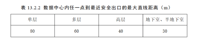 當(dāng)數(shù)據(jù)中心按照廠房進(jìn)行設(shè)計(jì)時(shí),數(shù)據(jù)中心的火災(zāi)危險(xiǎn)性分類(lèi)應(yīng)為丙類(lèi),數(shù)據(jù)中心內(nèi)任一點(diǎn)到最近安全出口的直線距離不應(yīng)大于表13.2.2的規(guī)定。當(dāng)主機(jī)房設(shè)有高靈敏度的吸氣式煙霧探測(cè)火災(zāi)報(bào)警系統(tǒng)時(shí),主機(jī)房?jī)?nèi)任一點(diǎn)到最近安全出口的直線距離可增加50%。