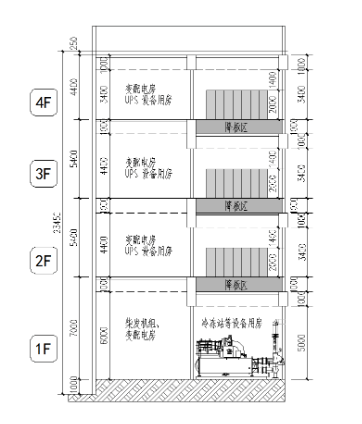 非降板區(qū)域:合計(jì)層高6800~7000mm+結(jié)構(gòu)梁(板)1000mm=設(shè)備房?jī)舾?800~6000mm。該區(qū)域可設(shè)置對(duì)凈高要求最大的柴發(fā)機(jī)組等設(shè)備用房。