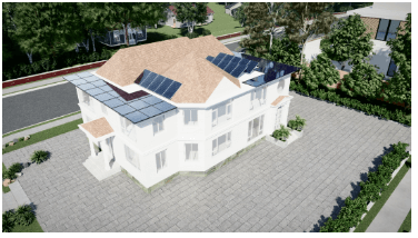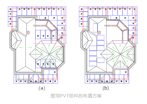 原有屋面系統(tǒng)上2處坡度安裝的PVT組件,則過于突兀,對建筑外觀破壞過大;且位于小平臺上的4塊PVT組件采光條件復(fù)雜,在系統(tǒng)中又與南向坡面的4塊PVT組件同處一個組串,相互干擾,影響系統(tǒng)效率。因此,重新考慮將其布置于東向和西向坡屋面上,如下圖b,雖然也對建筑觀瞻有一定負面影響,但隨著近些年公眾對屋面光伏系統(tǒng)的接受度越來越高,屋面上整齊敷貼布設(shè)的光伏板已經(jīng)成為業(yè)主前衛(wèi)新潮、崇尚環(huán)保的新標簽。屋頂小平臺建議恢復(fù)為屋頂花園景觀,提升整個建筑的靈動感。