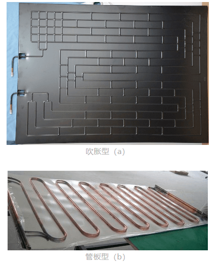 從制造工藝上,最常見的換熱板有吹脹型(a)和管板型(b),見下圖: