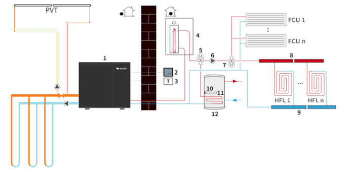 方案一:安裝一臺滿足冷負荷64.22kW的空氣源熱泵。此方案為典型的冷暖熱水3聯(lián)供系統(tǒng),常見系統(tǒng)如下圖??諝庠礋岜孟募居糜诳照{(diào)制冷、冬季用于供暖、熱水在供暖季采用熱泵切換加熱、在非采暖季采用電加熱管加熱。如果設(shè)想夏季利用PVT的熱量加熱水箱,鑒于熱水的需熱量過小,系統(tǒng)的復(fù)雜程度不宜過高,不予采納。又由于空氣源熱泵與pvt熱量耦合利用的季節(jié)性矛盾,本項目不適用此方案。