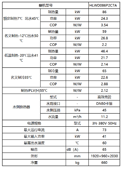 空氣源熱泵主機,選用海悟HLWD086P2C7A空氣源熱泵機組1臺,該機組低溫工況制熱量(-12℃)為59kW、COP為2.2,極端氣候或地源熱泵系統(tǒng)故障時,可作為供暖熱源備份;額定制冷量65kW,滿足本項目夏季制冷的需求。