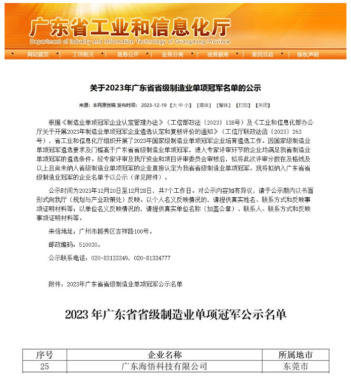 近日,廣東省工業(yè)和信息化廳公示了《2023年廣東省省級制造業(yè)單項冠軍名單》,廣東海悟科技有限公司憑借卓越的自主創(chuàng)新能力和生產(chǎn)制造能力,成功獲評“2023年廣東省省級制造業(yè)單項冠軍”!