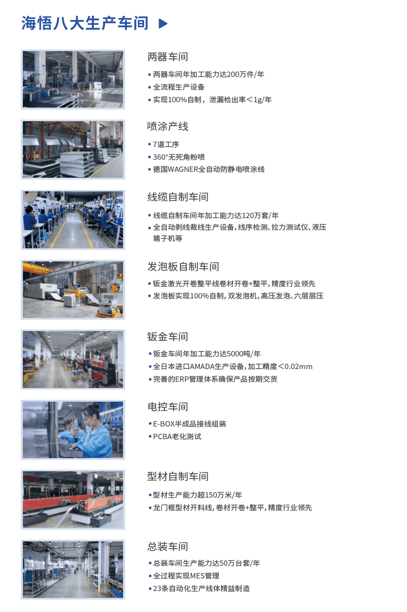 海悟產(chǎn)業(yè)園區(qū)擁有八大生產(chǎn)車間,是行業(yè)內(nèi)規(guī)模最大的生產(chǎn)基地之一。憑借先進的工藝和自動化設(shè)備,實現(xiàn)兩器、鈑金、線纜、管路、型材、發(fā)泡板材、電控等關(guān)鍵零部件百分百自制。嚴格按照ISO9001質(zhì)量管理體系、車規(guī)級IATF16949等體系,實現(xiàn)全面質(zhì)量管理。通過PDM、SAP、MES等系統(tǒng)實施數(shù)字化生產(chǎn)管理,產(chǎn)品從設(shè)計、來料、制造到出貨全過程管理IT化,確保成本最優(yōu)、質(zhì)量可靠、交付及時。