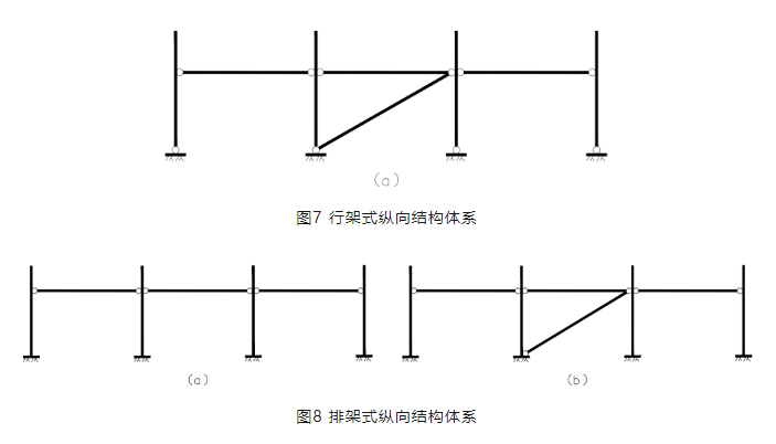 支架縱向結(jié)構(gòu)體系根據(jù)立柱與基礎(chǔ)的連接形式不同,同樣分為兩種結(jié)構(gòu)體系,柱底鉸接和柱底固結(jié)的形式。柱底鉸接形式為行架式縱向結(jié)構(gòu)體系,見(jiàn)圖7。柱底固結(jié)為排架式縱向結(jié)構(gòu)體系,見(jiàn)圖8。