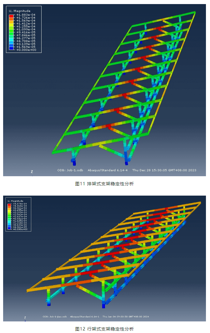 需要指出,排架式支架比行架式支架結(jié)構(gòu)約束更多,超靜定次數(shù)更高,因此結(jié)構(gòu)位移小,穩(wěn)定性好。從結(jié)構(gòu)穩(wěn)定性角度,本文推薦采用排架式支架結(jié)構(gòu)體系。
