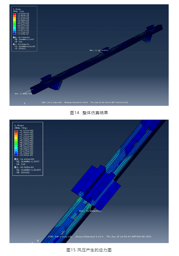 設(shè)計(jì)規(guī)范要求,支架采用的螺栓均固定擰緊。因此,各部分可視為緊密結(jié)合,不產(chǎn)生滑移,采用共單元節(jié)點(diǎn)進(jìn)行仿真分析。通過(guò)圖14及圖15可以看出,風(fēng)壓產(chǎn)生的最大應(yīng)力在橫梁上,為160.2MPA,小于鋼材強(qiáng)度設(shè)計(jì)值215MPA。