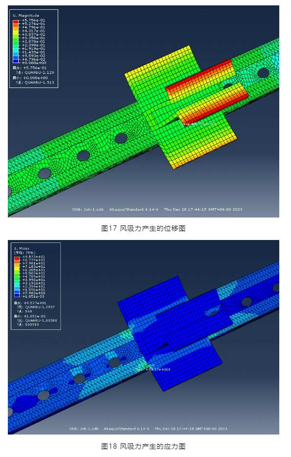 從圖16可以看出,風(fēng)壓產(chǎn)生的最大位移為0.95mm(特別指出該位移與圖11、12所示位移不同,是因?yàn)楹奢d施加方式不同,圖11及圖12僅為驗(yàn)證結(jié)構(gòu)體系整體穩(wěn)定性,因此荷載采取沿橫梁施加線荷載的方式),橫梁截面無(wú)翹曲,因此,該創(chuàng)新壓塊節(jié)點(diǎn)滿足強(qiáng)度要求。