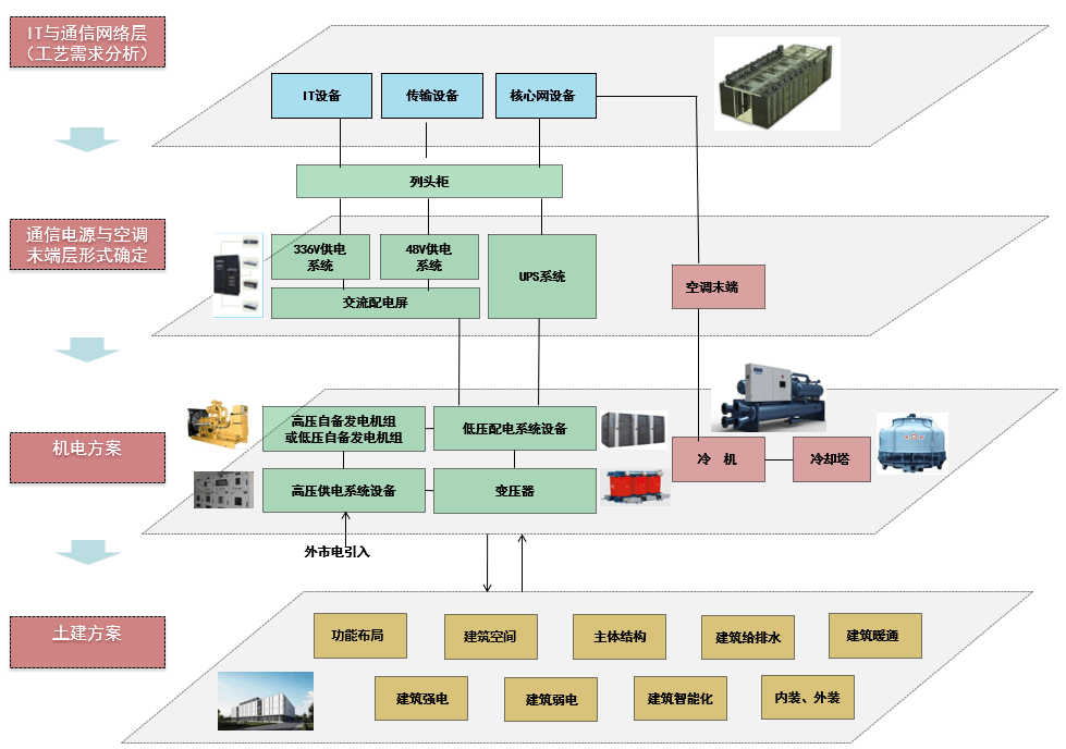 數(shù)據(jù)中心的建筑設(shè)計(jì)流線主要分為運(yùn)營(yíng)流線,設(shè)備運(yùn)輸流線,機(jī)房參觀流線,每個(gè)流線應(yīng)避免交叉,機(jī)房的流線主要圍繞數(shù)據(jù)機(jī)房來(lái)設(shè)計(jì),其中,高壓機(jī)房、分界室、并機(jī)室、冷凍站、ECC監(jiān)控室、通信機(jī)房等主要布置在首層位置,二層及以上根據(jù)數(shù)據(jù)機(jī)房的布置,布置相應(yīng)的低壓機(jī)房、電池室、UPS間等;