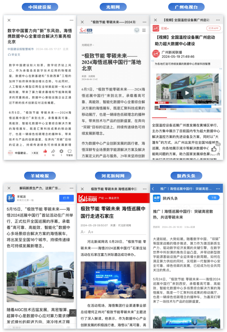 “2024海悟巡展中國行”攜先進(jìn)數(shù)據(jù)中心綠色解決方案一路前行的同時(shí),還受到了廣泛的社會(huì)關(guān)注。截至目前,海悟巡展中國行已獲中國建設(shè)報(bào)、光明網(wǎng)、廣州電視臺(tái)、廣州經(jīng)視頻道、羊城晚報(bào)、廣州日?qǐng)?bào)、東莞日?qǐng)?bào)、佛山PLUS、河北新聞網(wǎng)、西部網(wǎng)、陜西頭條、中國高新網(wǎng)等多家主流媒體的聚焦報(bào)道,海悟的品牌實(shí)力、專業(yè)口碑、社會(huì)影響力顯著提升。
