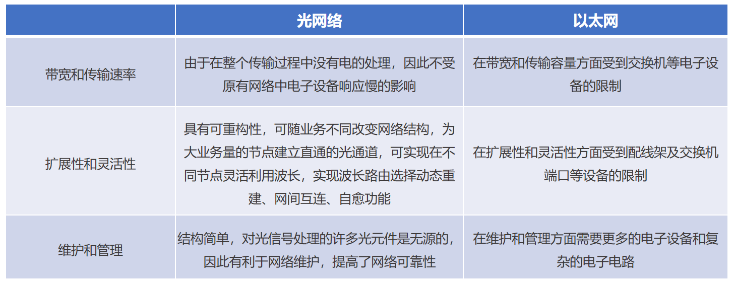 MPO/MTP預(yù)連接系統(tǒng)適用于高密度的機(jī)柜,采用模塊化設(shè)計(jì),便于日后的擴(kuò)展和維護(hù),對(duì)于大規(guī)模光纖連接項(xiàng)目,使用MPO/MTP預(yù)連接系統(tǒng)可顯著節(jié)約成本。并且可以借助3D可視化平臺(tái),實(shí)現(xiàn)跳線、鏈路的查詢和顯示,提高系統(tǒng)可靠性和維護(hù)效率,降低運(yùn)維管理成本。隨著AI、大數(shù)據(jù)及云計(jì)算的蓬勃發(fā)展,網(wǎng)絡(luò)帶寬傳輸速率的要求不斷提高,光網(wǎng)絡(luò)將逐漸成為主流,而光網(wǎng)絡(luò)對(duì)比目前的以太網(wǎng)有以下幾點(diǎn)優(yōu)勢(shì):