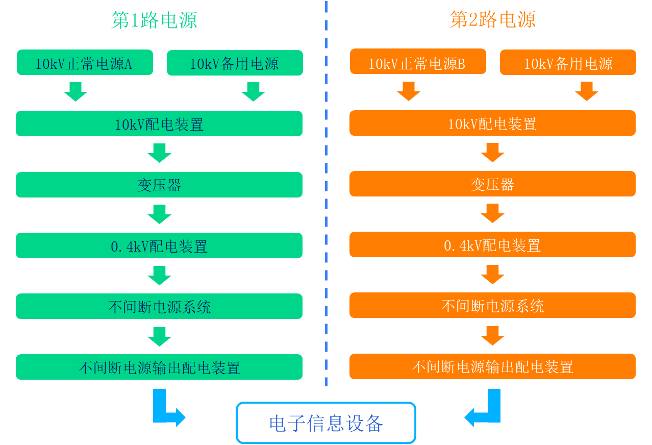 為提高電源的可靠性,電子信息設(shè)備由雙路電源供電。大中型數(shù)據(jù)中心供配電系統(tǒng)就是從10kV 電源進線,經(jīng)過10kV配電裝置、變壓器、0.4kV配電裝置、不間斷電源系統(tǒng)及不間斷電源輸出配電裝置,到電子信息設(shè)備電源進線這個過程。在這個過程中有兩種應用方式影響了數(shù)據(jù)中心供配電系統(tǒng):