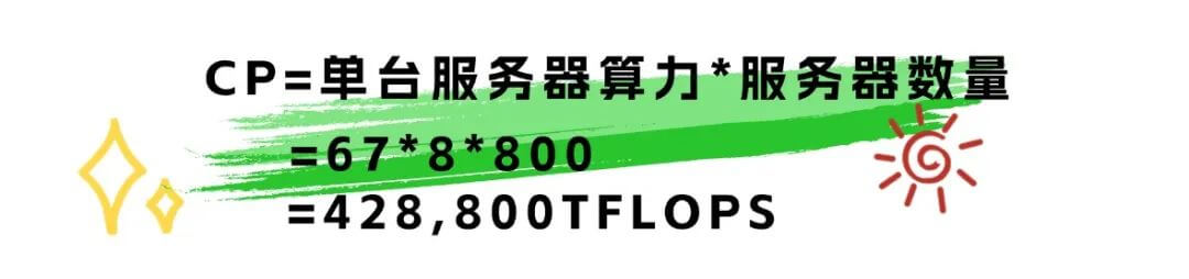 通過上表查出,H100 GPU單卡算力為67TFLOPS, 單臺服務器共有8張GPU卡。在忽略CPU算力的情況下,可計算出數(shù)據(jù)中心中心的算力規(guī)模為: