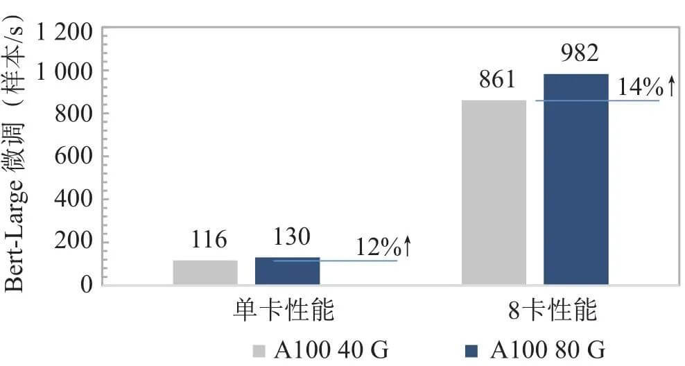 從宏觀技術(shù)發(fā)展趨勢上看,在過去20年間芯片的算力峰值以每2年3倍的速度增長,但是內(nèi)存的帶寬增長速度只有1.6倍[11]。內(nèi)存的性能提升速度遠低于處理器的性能提升速度,這就使得芯片計算力和運載力之間的剪刀差越來越大,僅通過增加處理器數(shù)量和核心數(shù),也無法有效提高整體的計算能力。為此,NVIDIA從V100開始,在每一代芯片中間都會有一次顯存升級,以A100為例,首發(fā)版本采用40 G HBM2顯存,帶寬最高1 555 GB/s,升級版本采用80 G HBM2,帶寬提升至2 039 GB/s,但這帶來的算力利用效率和應(yīng)用性能提升效果有限,A100 80 G在Bert-Large微調(diào)場景下性能提升僅14%(見圖3)。