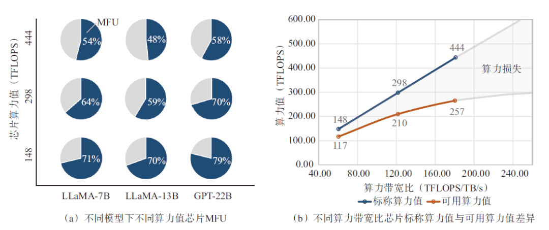 為了能夠量化顯存帶寬對芯片算力利用效率的影響,采用具有相同顯存(容量96 G、帶寬2.45 TB/s)、不同算力的人工智能加速卡,在具有不同參數(shù)規(guī)模大小的LLM模型預(yù)訓(xùn)練場景中進行了算力效率的實測。如圖4(a)所示,在使用BF16算力精度訓(xùn)練LLaMA-7B模型的過程中,BF16算力利用率隨芯片算力的降低而顯著增加,對于具有443 TFLOPS算力值的芯片而言,其算力利用率只有54%,而具有148 TFLOPS算力的芯片,算力利用率達到了71.3%,這意味著顯存帶寬限制了高算力芯片的算力利用效率。同樣的規(guī)律也反映在了LLaMA-13B和GPT-22B等更大參數(shù)規(guī)模的模型預(yù)訓(xùn)練實測結(jié)果中。如圖4(b)所示,當(dāng)標稱BF16性能從148 TFLOPS增加到298 TFLOPS,即標稱算力增加2倍的情況下,可用算力增加僅1.8倍,或者說算力損失29.6%;當(dāng)BF16性能進一步從298 TFLOPS繼續(xù)增加到443 TFLOPS,即標稱算力增加48.8%的情況下,可用算力性能僅增加22.4%,算力損失高達42.1%。由此可以推斷,算力性能進一步提高所帶來的可用算力收益會由于顯存帶寬的限制呈現(xiàn)邊際遞減,即GPT-4訓(xùn)練的MFU只有不到40%的原因。可以看出,“內(nèi)存墻”是限制當(dāng)前可用AI算力擴展的最大瓶頸。