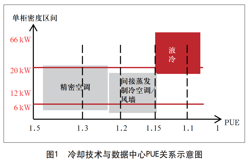 伴隨云計(jì)算、大數(shù)據(jù)、人工智能等技術(shù)的發(fā)展和應(yīng)用,作為信息基礎(chǔ)設(shè)施的數(shù)據(jù)中心及相關(guān)設(shè)備承擔(dān)的計(jì)算量越來越大,數(shù)據(jù)中心服務(wù)器及通信設(shè)備自身處理能力和集成度不斷提高,同時(shí)也帶來了功率密度節(jié)節(jié)攀升的問題,高熱密度給制冷設(shè)備和技術(shù)提出了更高要求。受限于物理空間以及空氣比熱容低的特性,風(fēng)冷技術(shù)難以滿足高功率元器件散熱負(fù)荷需求,如圖1所示。