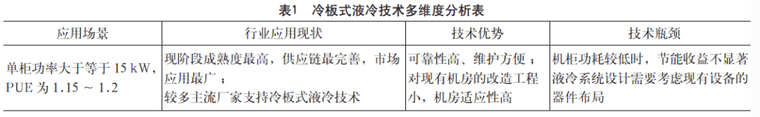 從應(yīng)用場景、行業(yè)應(yīng)用現(xiàn)狀及技術(shù)本身的優(yōu)劣勢等多個(gè)方面對冷板式液冷技術(shù)進(jìn)行分析,具體分析結(jié)果見表一。