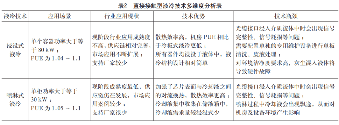 針對浸沒式液冷技術(shù)和噴淋式液冷技術(shù),分別從應(yīng)用場景、行業(yè)應(yīng)用現(xiàn)狀及技術(shù)本身的優(yōu)劣勢進(jìn)行多維度分析,具體分析結(jié)果見表 2。