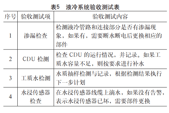 集成測試工作完成,且所有測試項(xiàng)均達(dá)到測試標(biāo)準(zhǔn)后,可以組織硬件集成的驗(yàn)收工作。整體驗(yàn)收過程應(yīng)參考驗(yàn)收規(guī)范要求,涵蓋機(jī)房環(huán)境、硬件安裝工藝檢查、設(shè)備 配置、連通性及健壯性、安全性等內(nèi)容。針對液冷數(shù)據(jù)中心硬件集成系統(tǒng),需著重關(guān)注的驗(yàn)收測試內(nèi)容見表5。