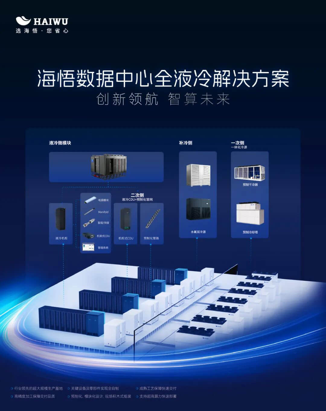 面對算力變革及機房實際運營需求,海悟針對超算、智算等高密場景,通過模塊化、預(yù)制化等關(guān)鍵技術(shù)打造極簡交付、極致節(jié)能、極致節(jié)水、穩(wěn)定可靠、智能運維的高密近場風(fēng)墻、冷板式液冷、浸沒式液冷等全場景解決方案產(chǎn)品。