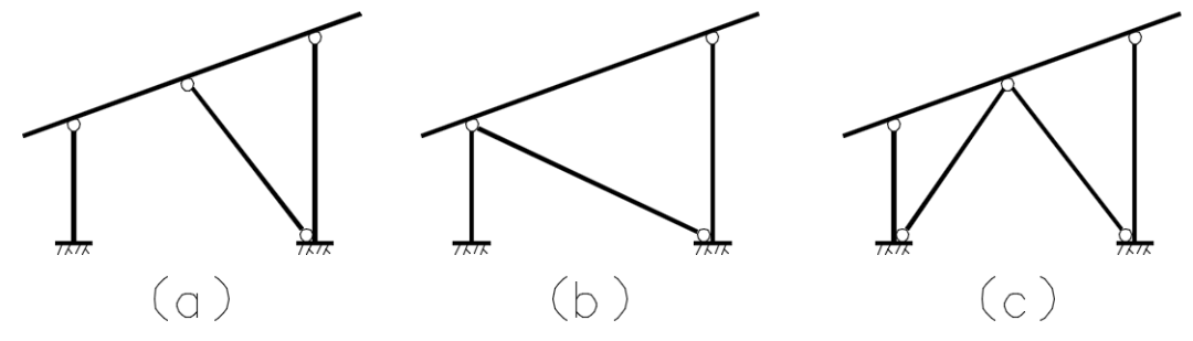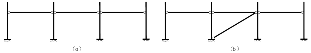 圖4所示支架橫向結(jié)構(gòu)可根據(jù)立柱與基礎(chǔ)連接形式的不同,分為兩種結(jié)構(gòu)體系,柱底鉸接和柱底固結(jié)的形式。柱底鉸接形式為行架式橫向結(jié)構(gòu)體系,柱底固結(jié)為排架式橫向結(jié)構(gòu)體系。圖5所示兩種形式均為行架式橫向結(jié)構(gòu)體系,該結(jié)構(gòu)體系前后立柱與基礎(chǔ)采用鉸接的形式,并且采用一根或者兩根橫向支撐提供側(cè)向剛度,形成穩(wěn)定的結(jié)構(gòu)不變體系。圖6所示三種形式均為排架式橫向結(jié)構(gòu)體系,該結(jié)構(gòu)體系前后立柱與基礎(chǔ)采用固結(jié)的形式,并且采用一根或兩根縱向支撐提供側(cè)向剛度,增強(qiáng)結(jié)構(gòu)的抗側(cè)力穩(wěn)定性。基礎(chǔ)設(shè)計同傳統(tǒng)光伏支架。