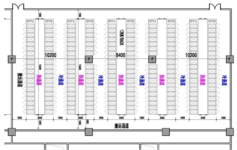 12kW/架機房根據(jù)冷通道寬度1.8米,柱網(wǎng)可為10.2米及8.4米相結合