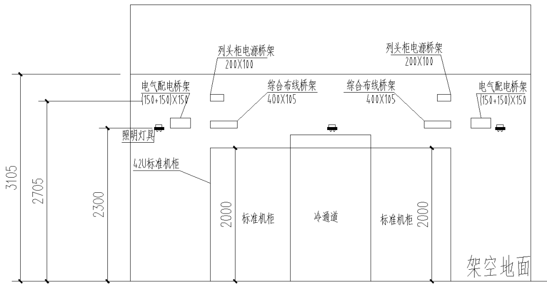 IT機房模塊間機柜高度為2000~2200mm,上部設置綜合布線和列頭柜出線橋架,強弱電間距300mm,凈高需求約3105~3400mm。