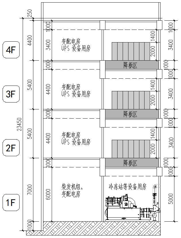 一層凈高:一層凈高以滿足變配電房和冷凍機房凈高需求為主,柴發(fā)機組設置在室內的亦考慮柴發(fā)機組凈高
