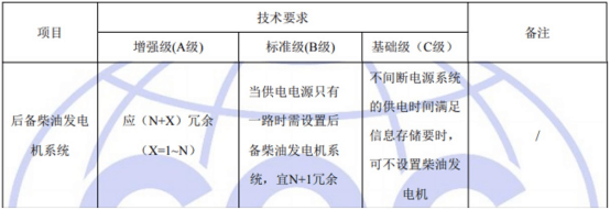 國(guó)標(biāo)GB50174-2017《數(shù)據(jù)中心設(shè)計(jì)規(guī)范》中對(duì)于A、B、C三級(jí)數(shù)據(jù)中心后備柴油發(fā)電機(jī)系統(tǒng)的具體要求如下:
