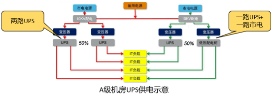 C級(jí)機(jī)房UPS按設(shè)備總?cè)萘窟x型即可,不需要冗余;B級(jí)機(jī)房UPS每四臺(tái)之外還要設(shè)置一臺(tái)冗余UPS,以備四臺(tái)中的一臺(tái)故障時(shí)接替其供電;A級(jí)機(jī)房可按照市電情況選擇2N架構(gòu)或者一路市電、一路UPS架構(gòu),一般項(xiàng)目均采用2N架構(gòu)。