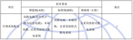 國(guó)標(biāo)GB50174-2017《數(shù)據(jù)中心設(shè)計(jì)規(guī)范》中對(duì)于A、B、C三級(jí)數(shù)據(jù)中心空調(diào)系統(tǒng)配電的具體要求如下: