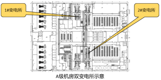 C級(jí)、B級(jí)機(jī)房無(wú)變配電所物理隔離要求;若C級(jí)、B級(jí)機(jī)房改A級(jí)機(jī)房,則每個(gè)變電所之間需做物理隔離。若配電系統(tǒng)采用2N構(gòu)架,則至少需要設(shè)置兩個(gè)物理隔離的變電所,每個(gè)變電所平時(shí)各帶50%負(fù)荷,當(dāng)一個(gè)變電所完全斷電時(shí),另一個(gè)變電所帶載100%負(fù)荷。若配電系統(tǒng)采用2+1的DR構(gòu)架,則至少需要設(shè)置三個(gè)物理隔離的變電所,每個(gè)變電所平時(shí)各帶66%負(fù)荷,當(dāng)其中一個(gè)變電所完全斷電時(shí),另兩個(gè)變電所帶載100%負(fù)荷。