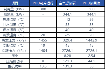 冬季采暖季節(jié), PHU熱回收機(jī)組可維持更高的蒸發(fā)溫度,利用小壓比壓縮機(jī),以極致的效率產(chǎn)出熱能,整機(jī)制熱能效比空氣源熱泵機(jī)組有顯著提升,從下面的對(duì)比表里可以一探端倪: