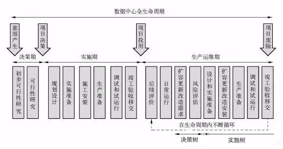 數(shù)據(jù)中心全生命周期,是指從建設(shè)意圖產(chǎn)生到數(shù)據(jù)中心經(jīng)濟(jì)壽命結(jié)束的全過程。通常分為決策期、實(shí)施期和生產(chǎn)運(yùn)維期,每一個(gè)時(shí)期又分為若干階段。具體如圖2-1所示。