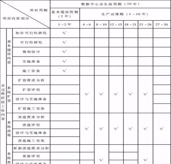 為了更好地區(qū)分各個(gè)建設(shè)階段,我們引入"數(shù)據(jù)中心基本建設(shè)周期"概念,是指:自項(xiàng)目開始至項(xiàng)目基本建設(shè)完成并達(dá)到預(yù)先規(guī)劃要求,數(shù)據(jù)中心可以提供正常運(yùn)營(yíng)使用為止的一個(gè)周期。這也就是建設(shè)項(xiàng)目決策期和實(shí)施期的內(nèi)容,不包含后期數(shù)據(jù)中心生產(chǎn)運(yùn)營(yíng)期內(nèi)的擴(kuò)容、更新和改造等內(nèi)容。