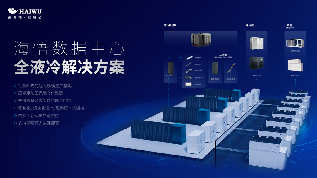針對超算、智算等高密場景,海悟推出了數(shù)據(jù)中心全液冷解決方案。該方案通過風(fēng)液融合、風(fēng)液同源、模塊化、預(yù)制化等關(guān)鍵技術(shù),充分考慮了方案設(shè)計(jì)、交付流程、運(yùn)行模式、運(yùn)維管理等全生命周期的環(huán)節(jié)要素。依托“全景應(yīng)用、全域適配、全速交付、全程可靠”的四大核心優(yōu)勢,海悟?yàn)楦呙芩懔鼍疤峁┝藦?qiáng)大的散熱支持。