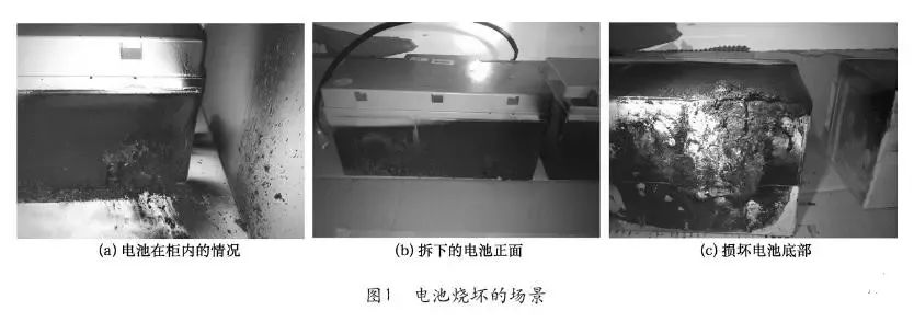①XX企業(yè)的二臺30kVAUPS,電池是12V/65Ah,其中一臺發(fā)生電池起火冒煙。煙霧非常大,整個配電室全是煙霧,電氣工作人員帶防毒用具進入配電室進行操作,因未見明火,消防隊到現(xiàn)場沒有處置,由電氣工作人員進行操作,用風機排煙?,F(xiàn)場情況是UPS轉旁路工作,有幾塊電池燒壞。圖1為電池燒壞的場景。
