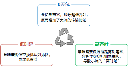 從上一節(jié)來(lái)看,為了滿足AI時(shí)代的數(shù)據(jù)高效處理訴求、應(yīng)對(duì)分布式架構(gòu)挑戰(zhàn),0丟包、低時(shí)延、高吞吐成為下一代數(shù)據(jù)中心網(wǎng)絡(luò)的三個(gè)核心指標(biāo)。這三個(gè)核心指標(biāo)是互相影響,有蹺蹺板效應(yīng),同時(shí)達(dá)到最優(yōu)有很大的挑戰(zhàn)。