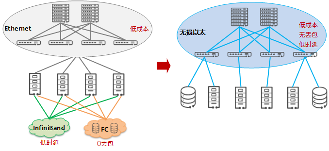 傳統(tǒng)的FC專網(wǎng)和IB專網(wǎng),價(jià)格昂貴,生態(tài)封閉,且需要專人運(yùn)維,也不支持SDN,無(wú)法滿足云網(wǎng)協(xié)同等自動(dòng)化部署的訴求。