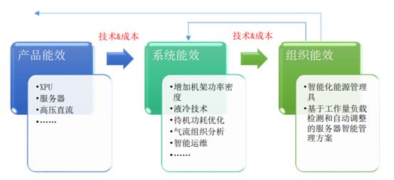 數(shù)據(jù)中心整體能源效率的提高離不開其各組成設備的能效提升,或者說提升設備的能效能夠直接有效提高數(shù)據(jù)中心的能效,例如提高服務器能效、減少供電損耗等,但設備級能效提高會遇到瓶頸,到了一定程度由于技術和成本的限制,其能效無法再次提高或者提高能效造成成本急劇上升。在設備能效提升遇到困難后,通常采用提高系統(tǒng)能效的方式,例如通過負載優(yōu)化使服務器工作在高能效狀態(tài),待機服務器進行優(yōu)化;或者通過氣流組織分析,使制冷和空調(diào)散熱在時間和空間上進行匹配,因在系統(tǒng)能效的彈性比較大,通常從小的系統(tǒng)開始做起,逐漸引入更多變量,涉及的系統(tǒng)越來越多,同時再考慮管理因素,就成為從組織層面提高能效的方法和途徑。
