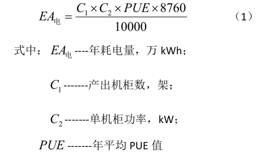 根據(jù)數(shù)據(jù)中心項(xiàng)目產(chǎn)出機(jī)柜數(shù)、單機(jī)柜功率、年平均PUE 值可求得數(shù)據(jù)中心年耗電量, 計(jì)算公式如下: